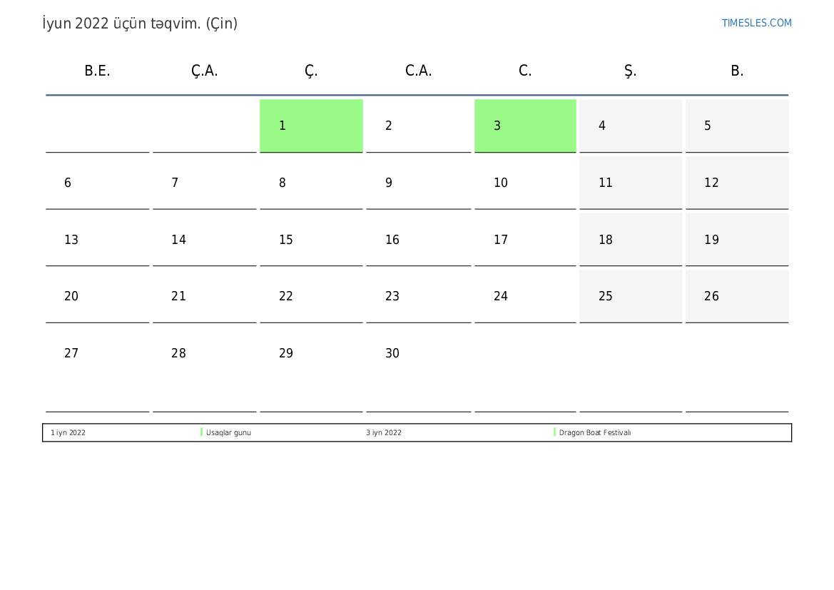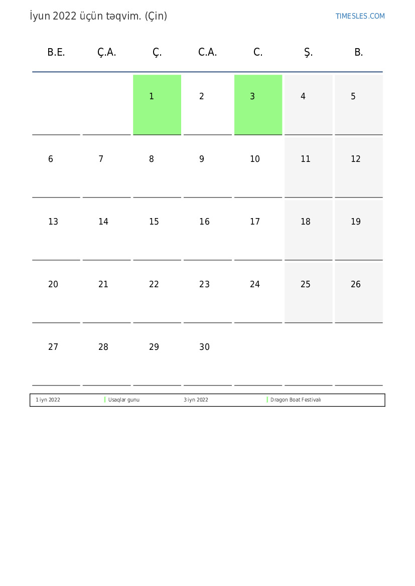Çin üçün İyun 2022 təqvimi