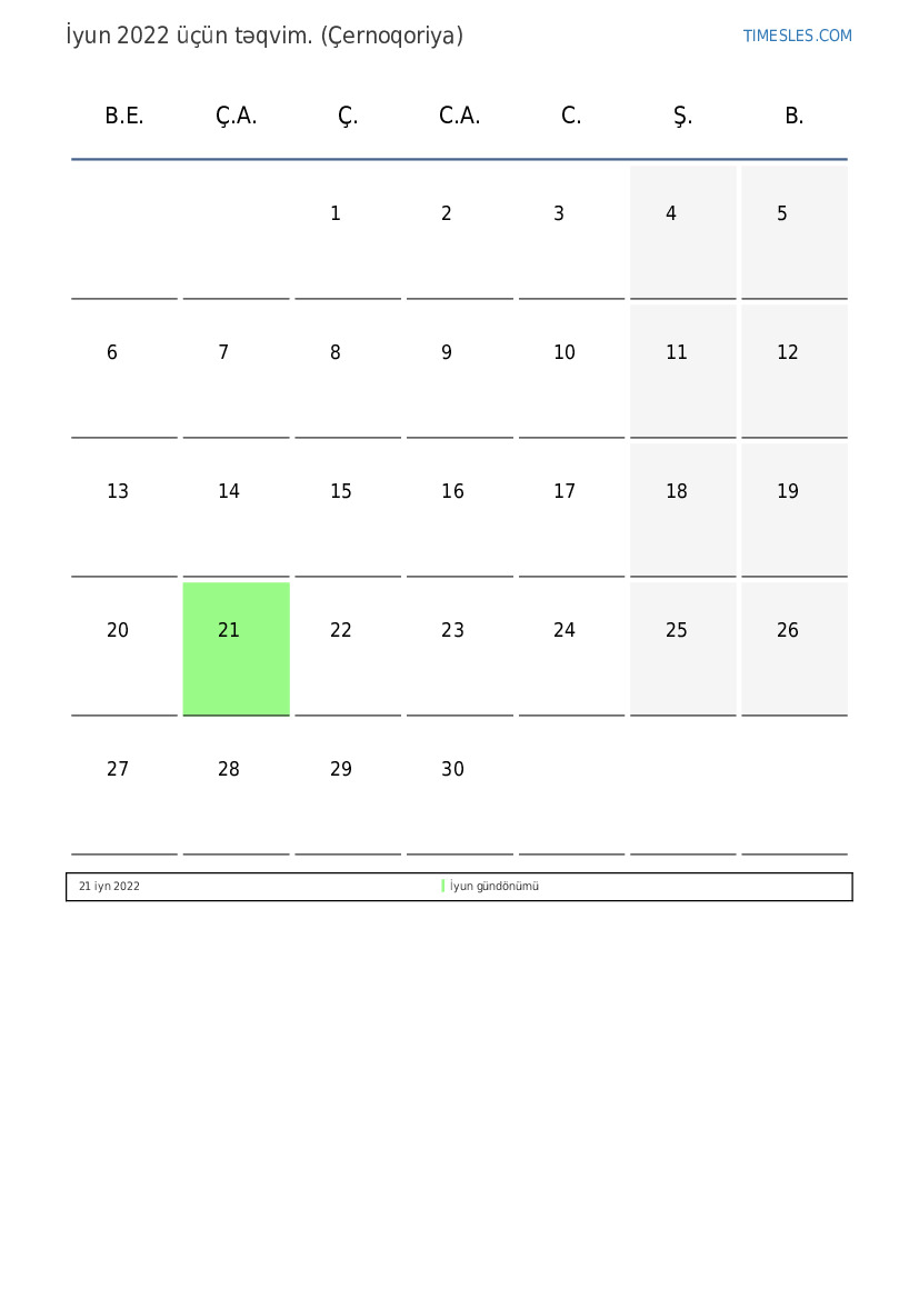 İyun ayı 30 gün əhatə edir. Bu, 2022-ci ilin 6 ayıdır. İlin mövsümü: yay. İyun ayı çərşənbə günü başlayır və cümə axşamı bitir. 2022-ci ilin İyun ayında Monteneqroda 1 tətil və istirahət günü var.
