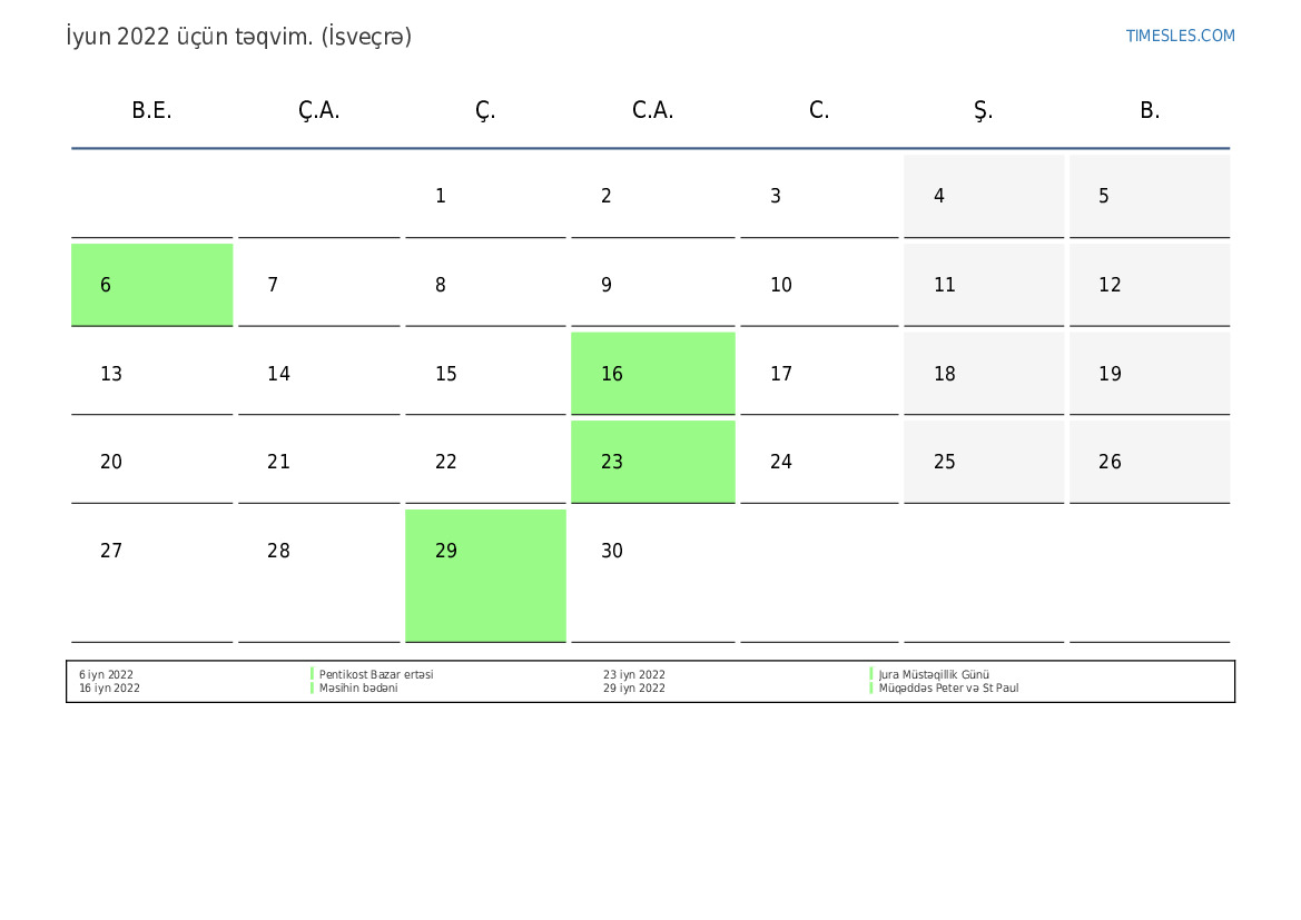 İsveçrə üçün İyun 2022 üçün Tətillər və Həftə Sonları Təqvim