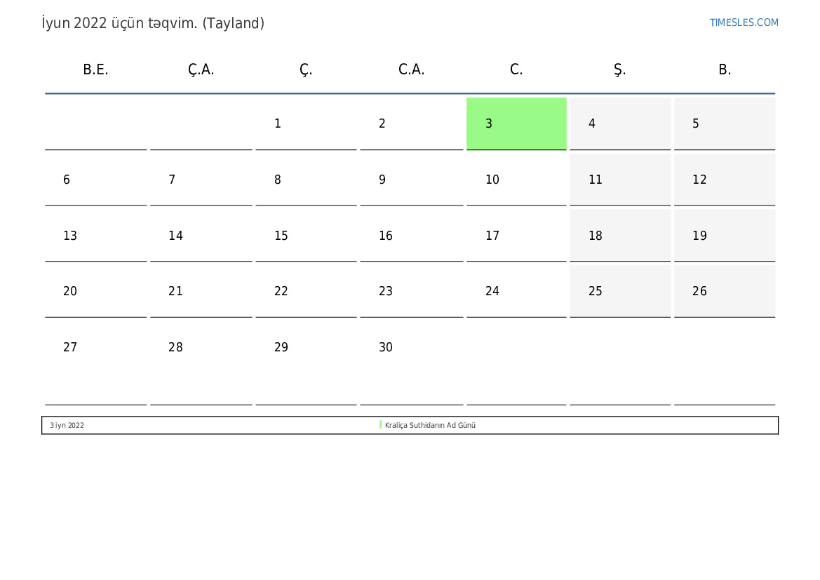 Tayland üçün İyun 2022 üçün tətil və həftə sonları ilə PDF təqvimini yükləyin və çap edin