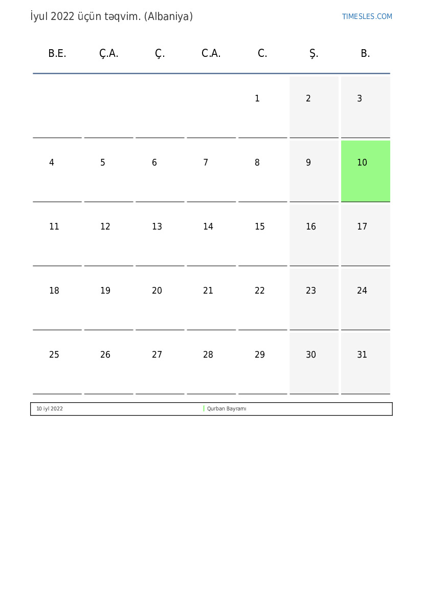 Albaniya üçün İyul 2022 üçün Tətillər və Həftə Sonları Təqvim