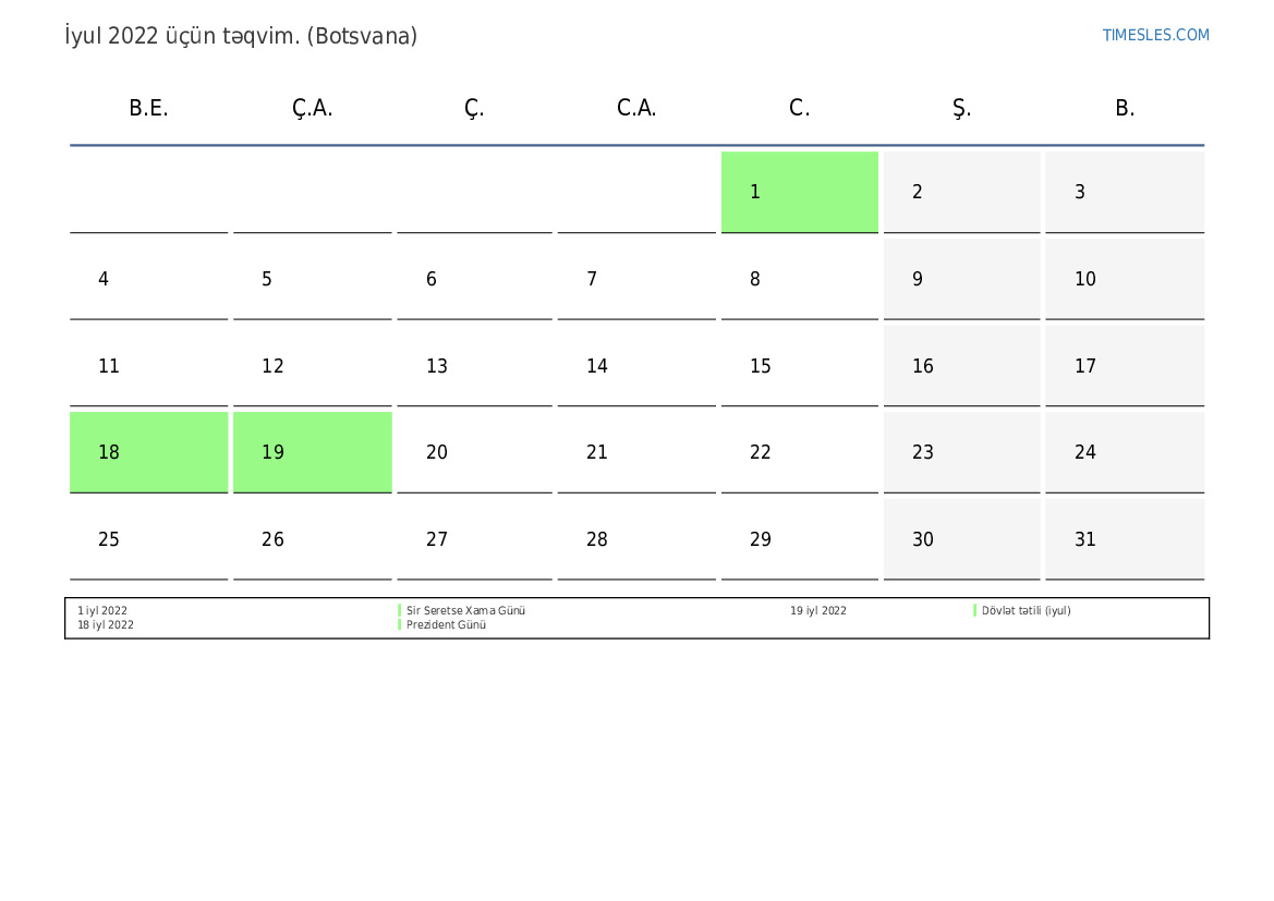 Botsvana üçün İyul 2022 üçün tətil və həftə sonları ilə PDF təqvimini yükləyin və çap edin