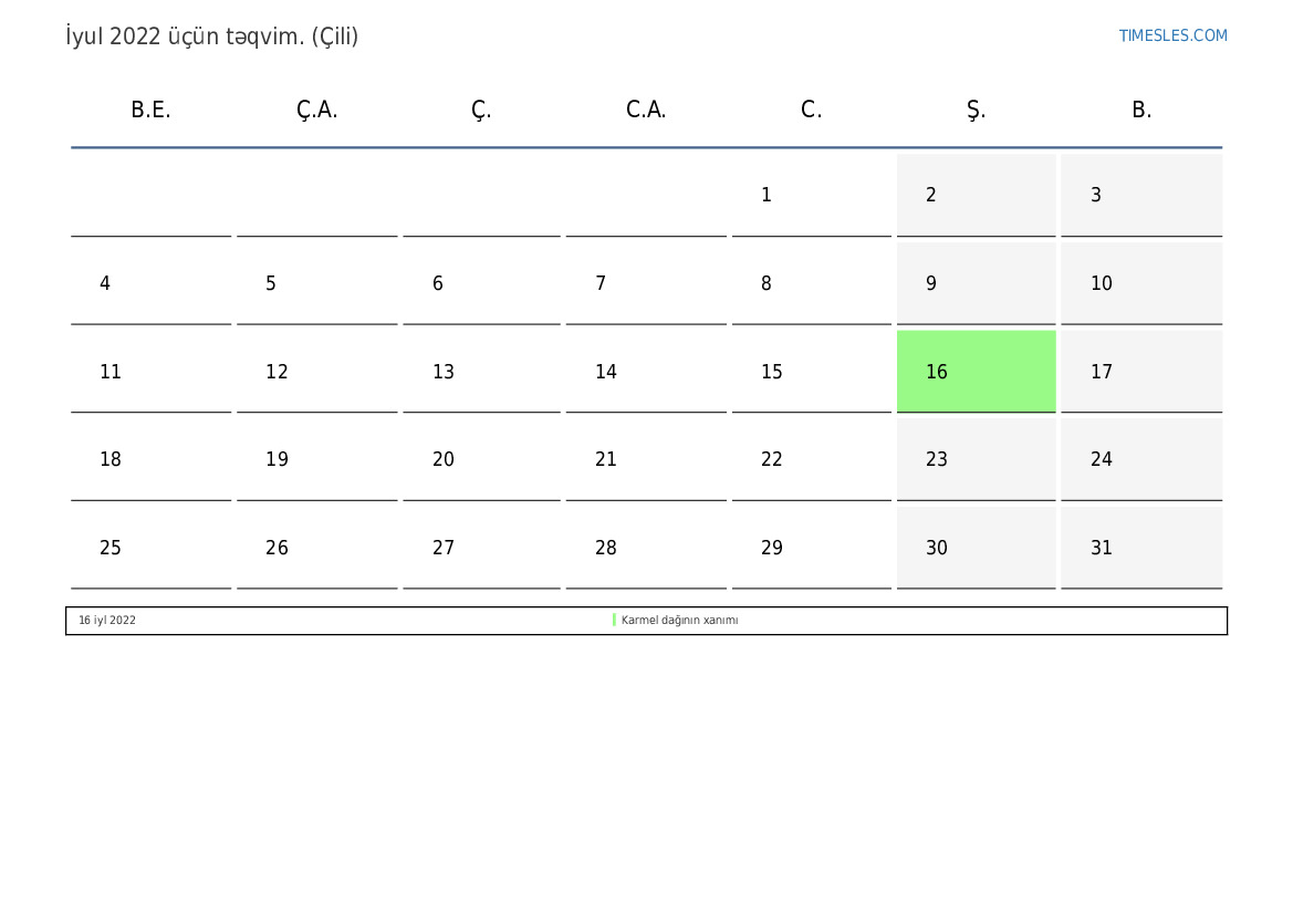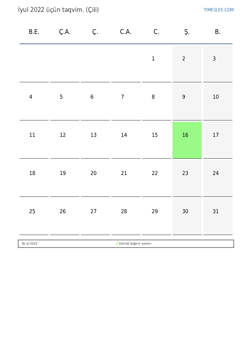 Çili üçün İyul 2022 üçün Tətillər və Həftə Sonları Təqvim