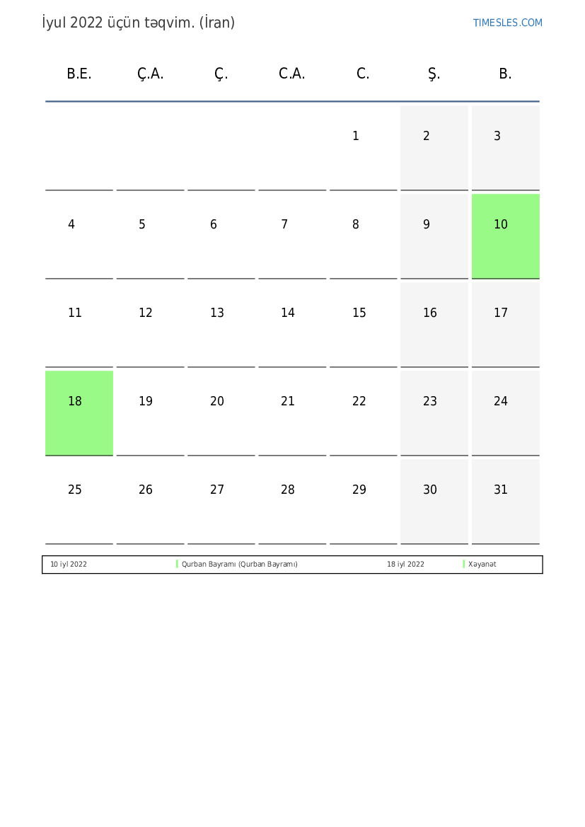 İran üçün İyul 2022 üçün Tətillər və Həftə Sonları Təqvim
