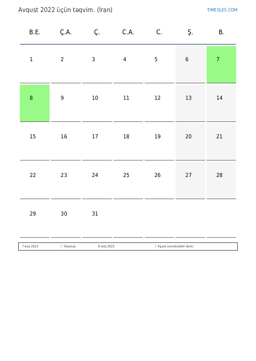 İran üçün Avqust 2022 üçün tətil və həftə sonları ilə PDF təqvimini yükləyin və çap edin