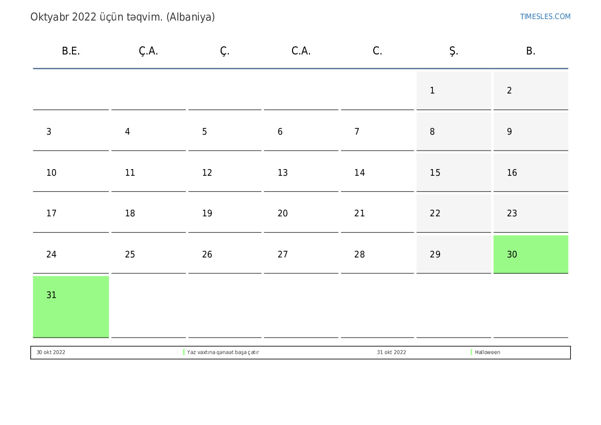 Albaniya üçün Oktyabr 2022 təqvimi