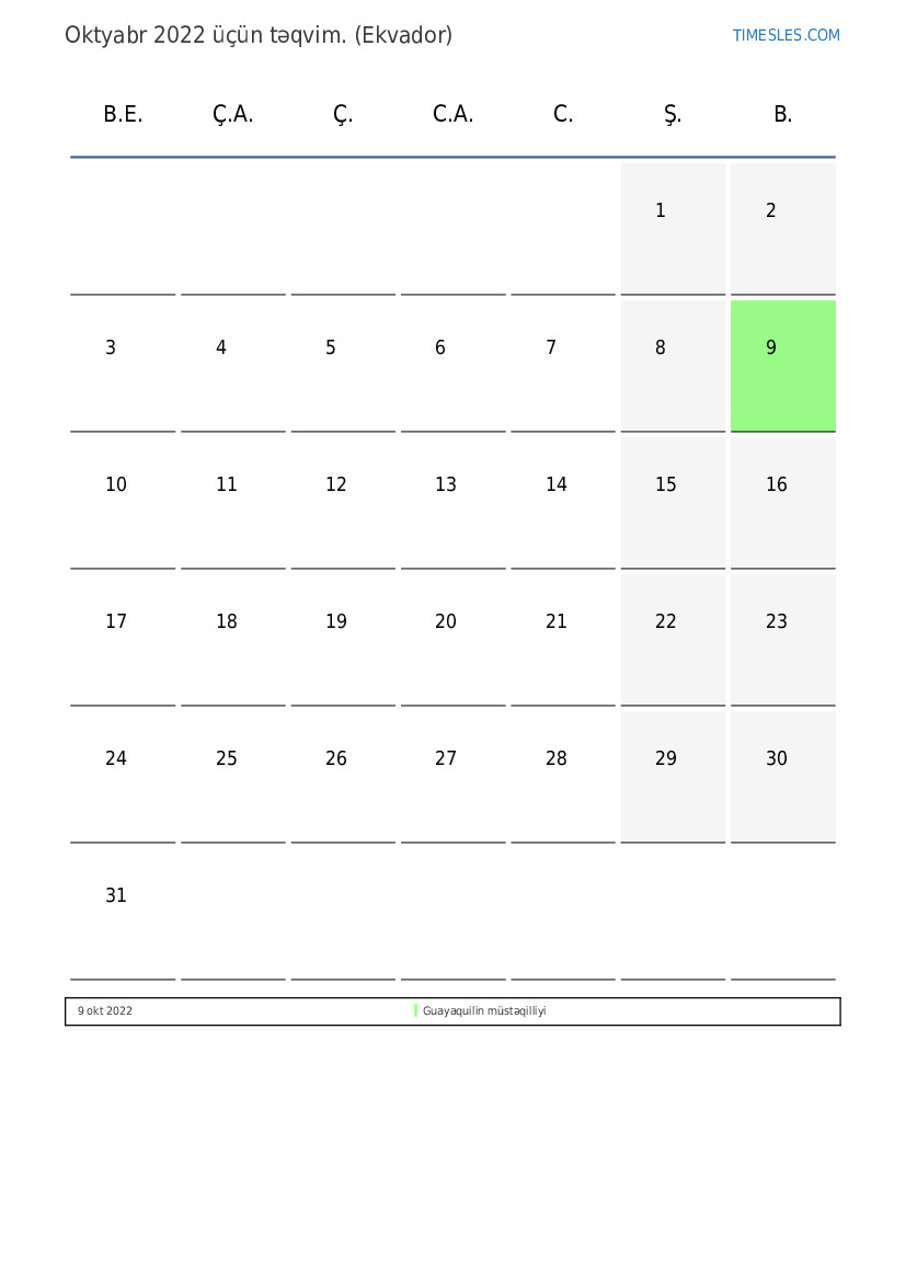 Ekvador üçün Oktyabr 2022 üçün Tətillər və Həftə Sonları Təqvim