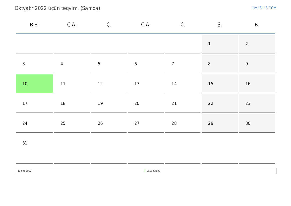 Samoa üçün Oktyabr 2022 üçün tətil və həftə sonları ilə PDF təqvimini yükləyin və çap edin