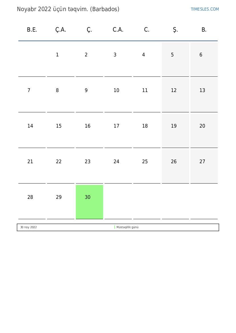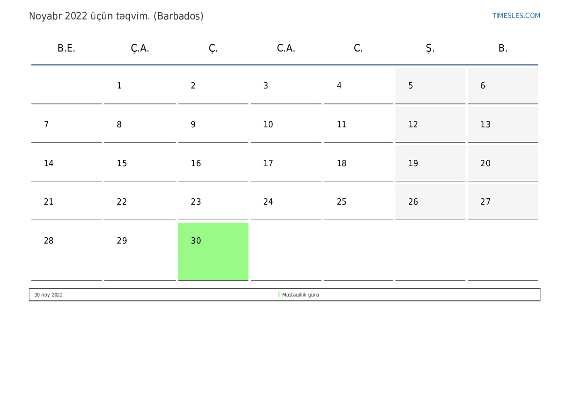 Barbados üçün Noyabr 2022 üçün tətil və həftə sonları ilə PDF təqvimini yükləyin və çap edin