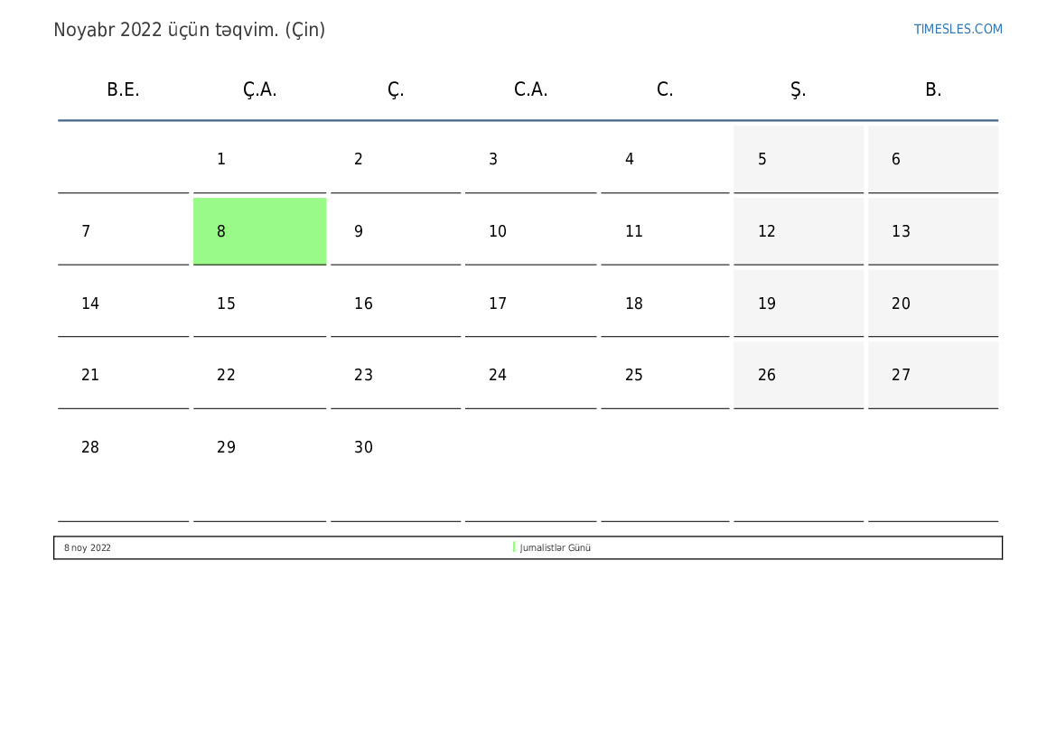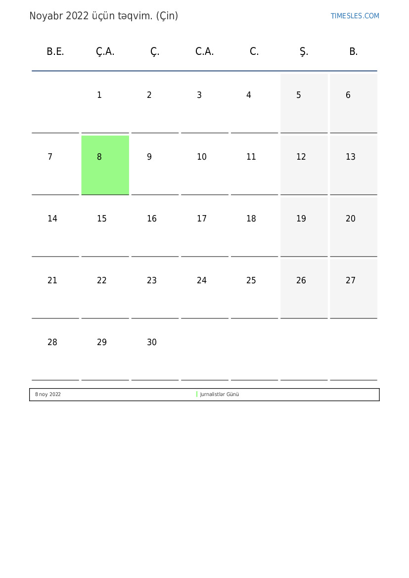 Çin üçün Noyabr 2022 üçün Tətillər və Həftə Sonları Təqvim