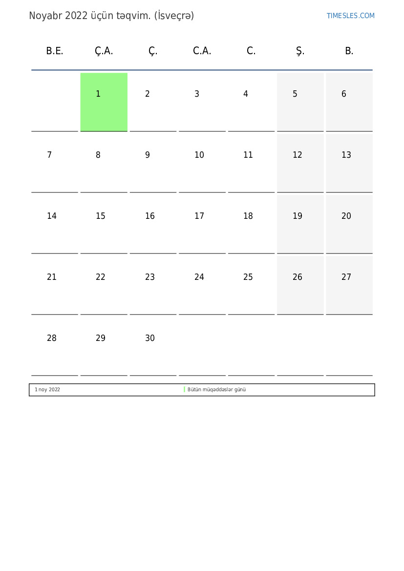 İsveçrə üçün Noyabr 2022 üçün Tətillər və Həftə Sonları Təqvim