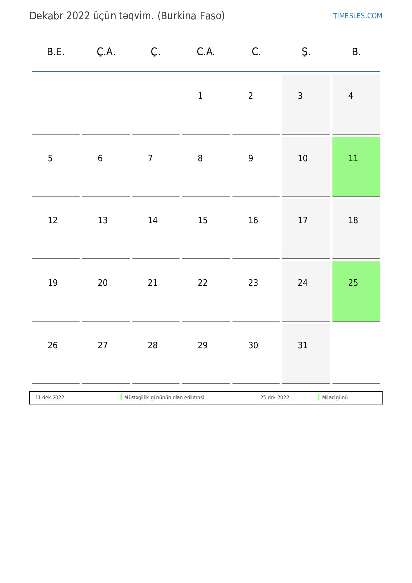 Burkina Faso üçün Dekabr 2022 üçün tətil və həftə sonları ilə PDF təqvimini yükləyin və çap edin
