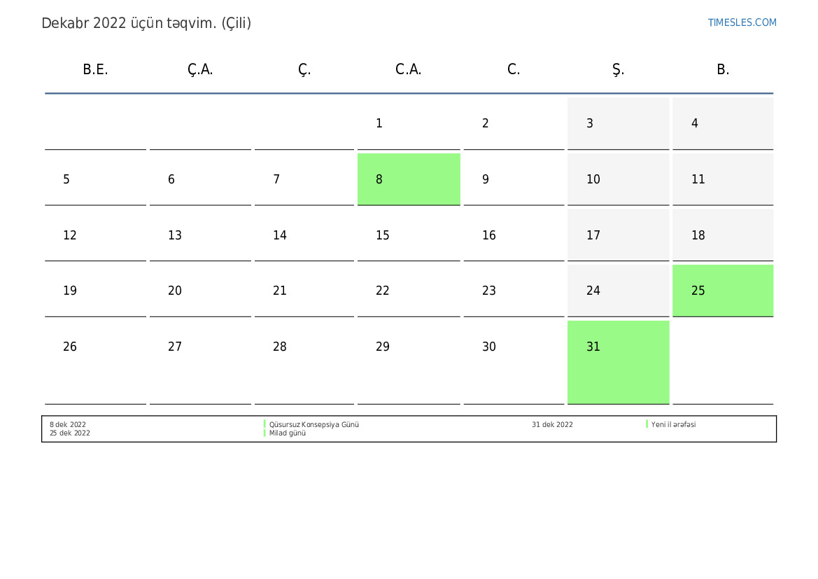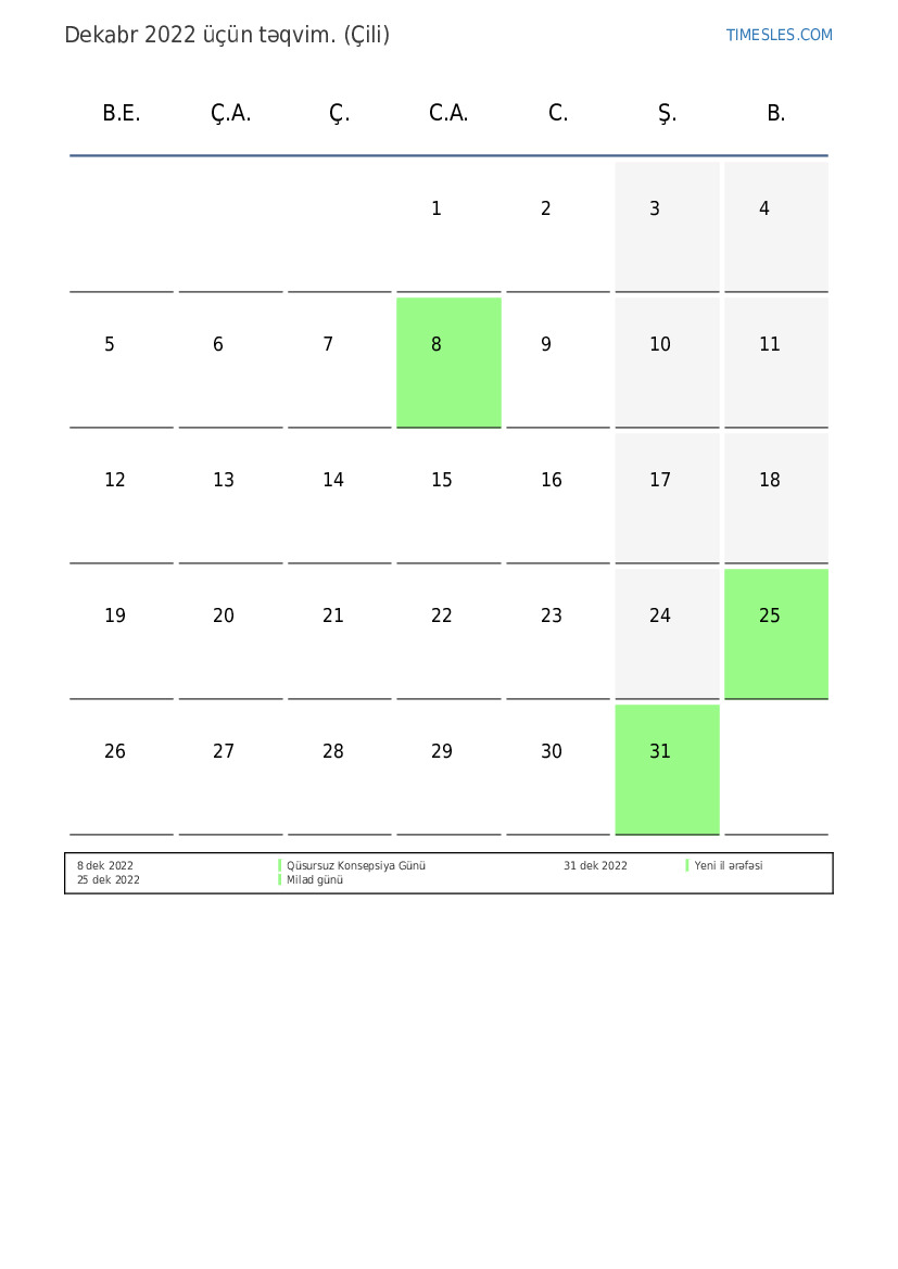 Çili üçün Dekabr 2022 təqvimi