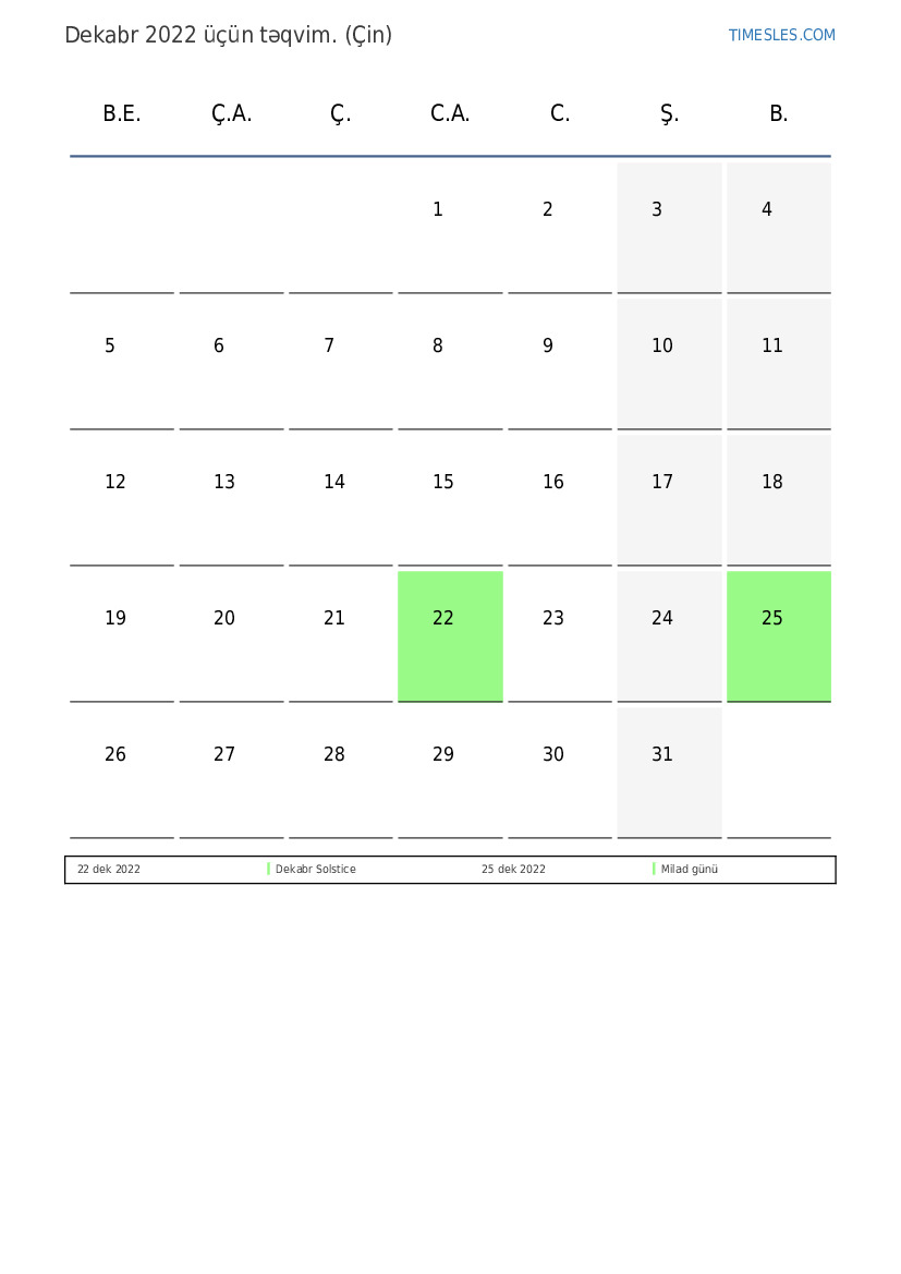 Çin üçün Dekabr 2022 üçün tətil və həftə sonları ilə PDF təqvimini yükləyin və çap edin