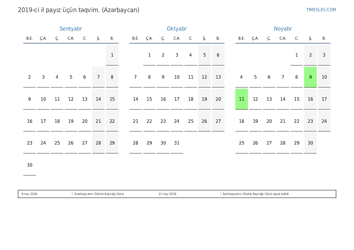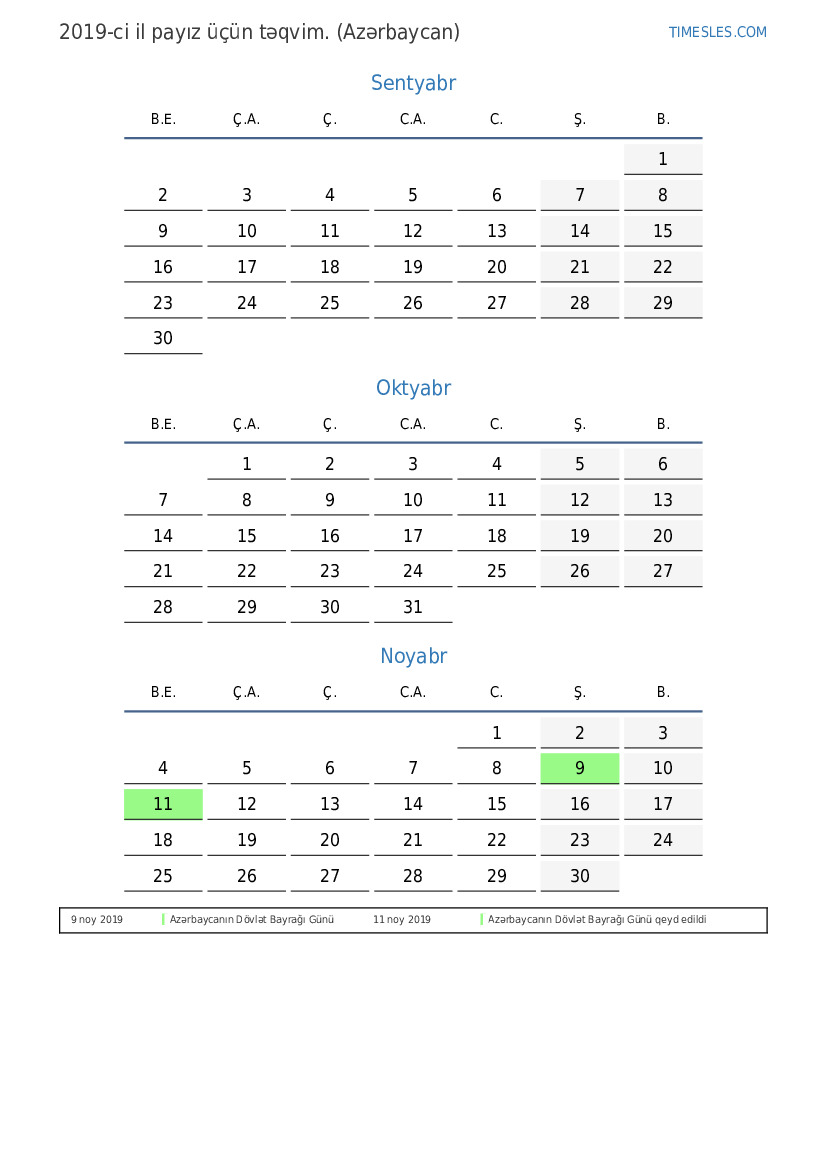 Azərbaycan üçün 2019-ci ilin payız üçün tətil və həftə sonları təqvimi