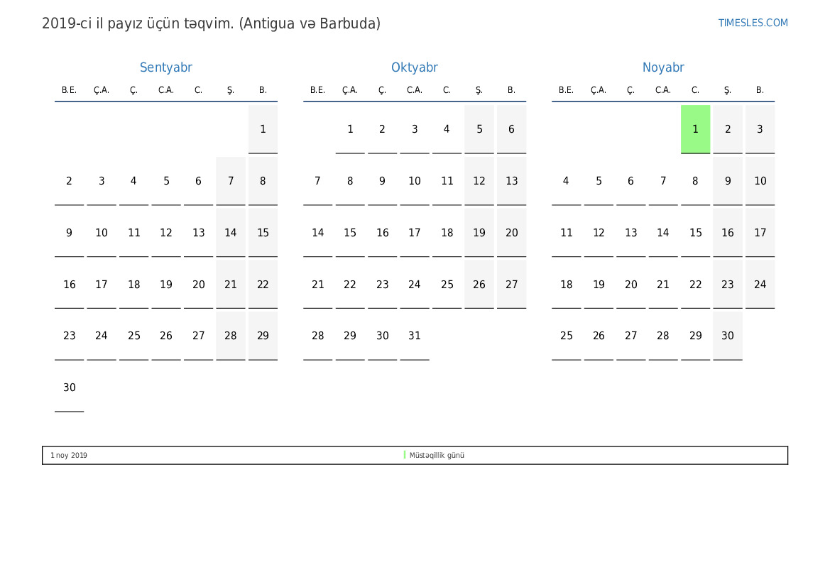 Antigua və Barbuda üçün 2019-ci il payız üçün təqvim