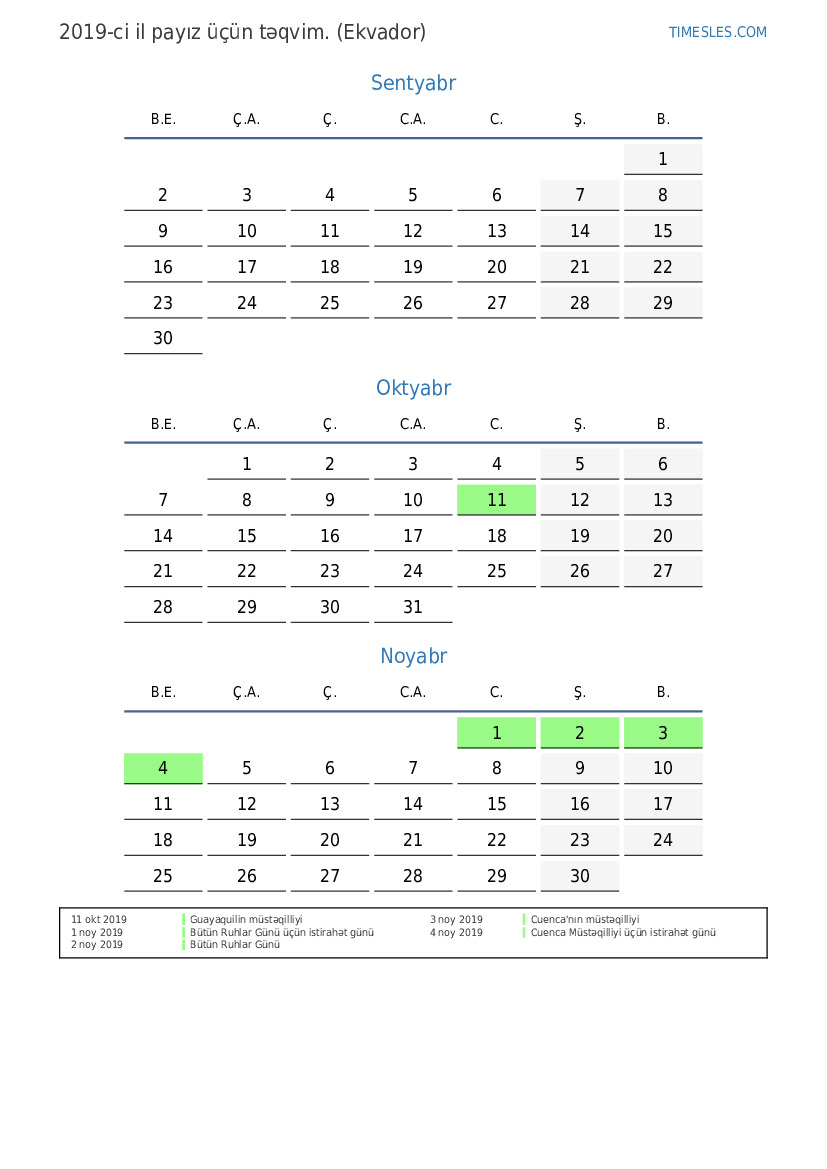 Ekvador üçün 2019-ci ilin payız üçün tətil və həftə sonları ilə PDF təqvimini yükləyin və çap edin