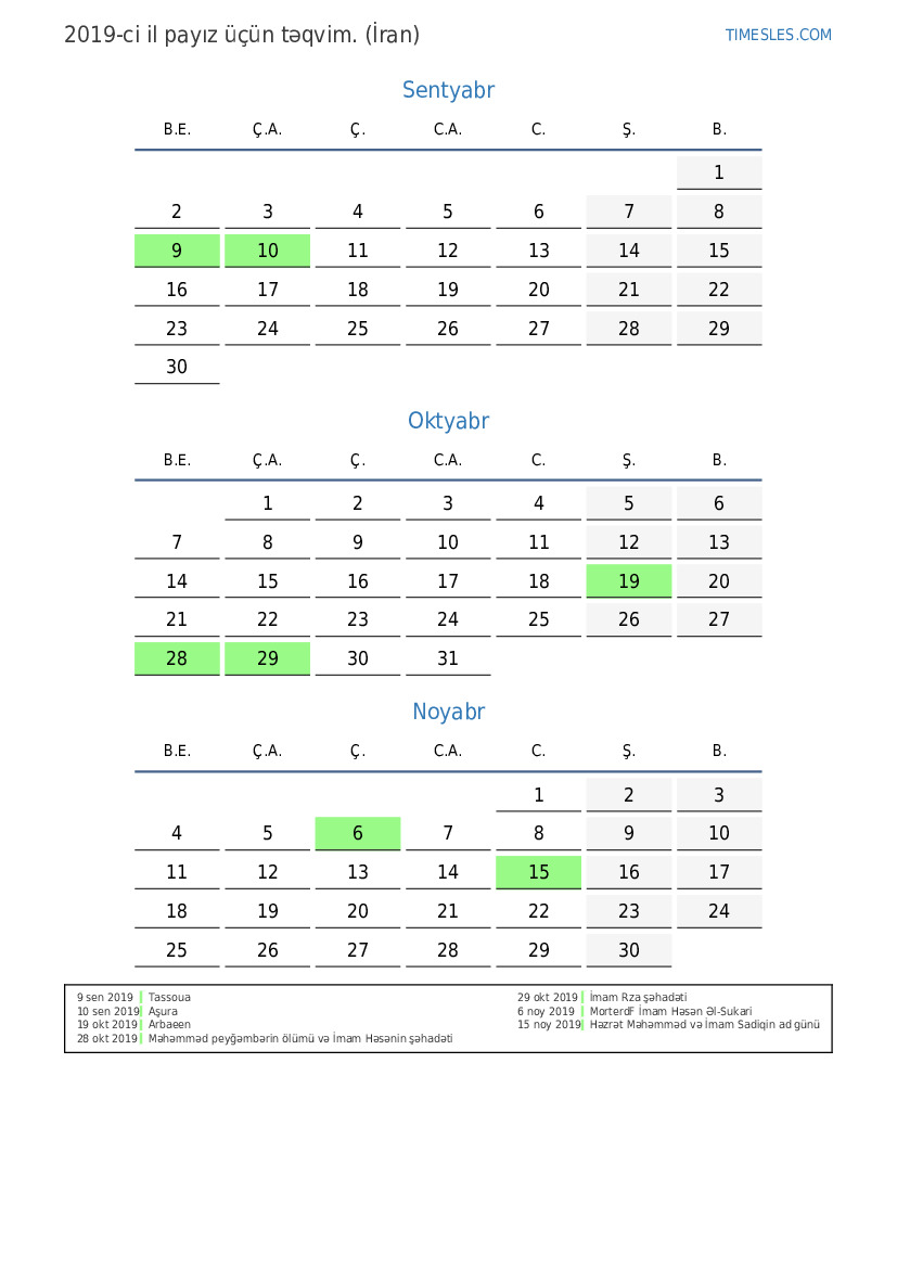 İran üçün 2019-ci ilin payız üçün tətil və həftə sonları ilə PDF təqvimini yükləyin və çap edin