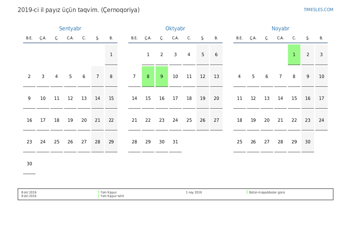 Montenegro üçün 2019-ci ilin payız üçün tətil və həftə sonları ilə PDF təqvimini yükləyin və çap edin