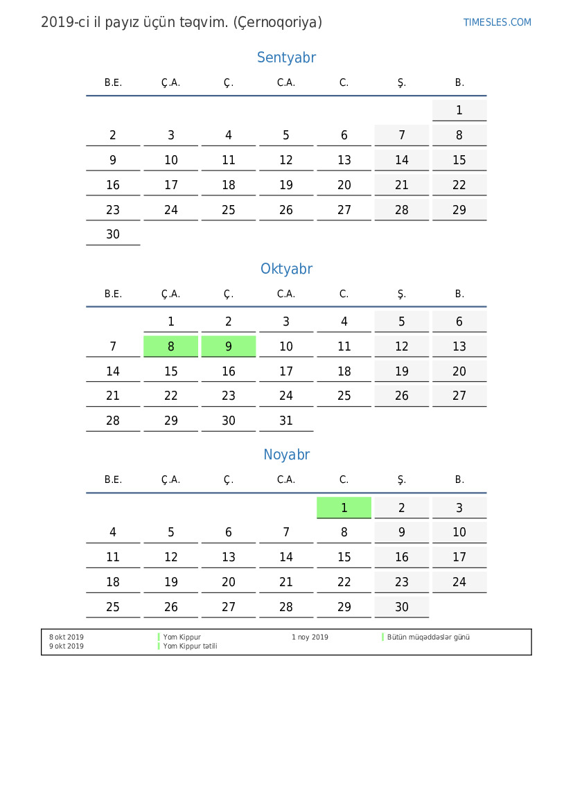 Montenegro üçün 2019-ci il payız üçün təqvim