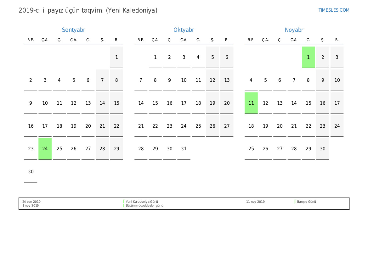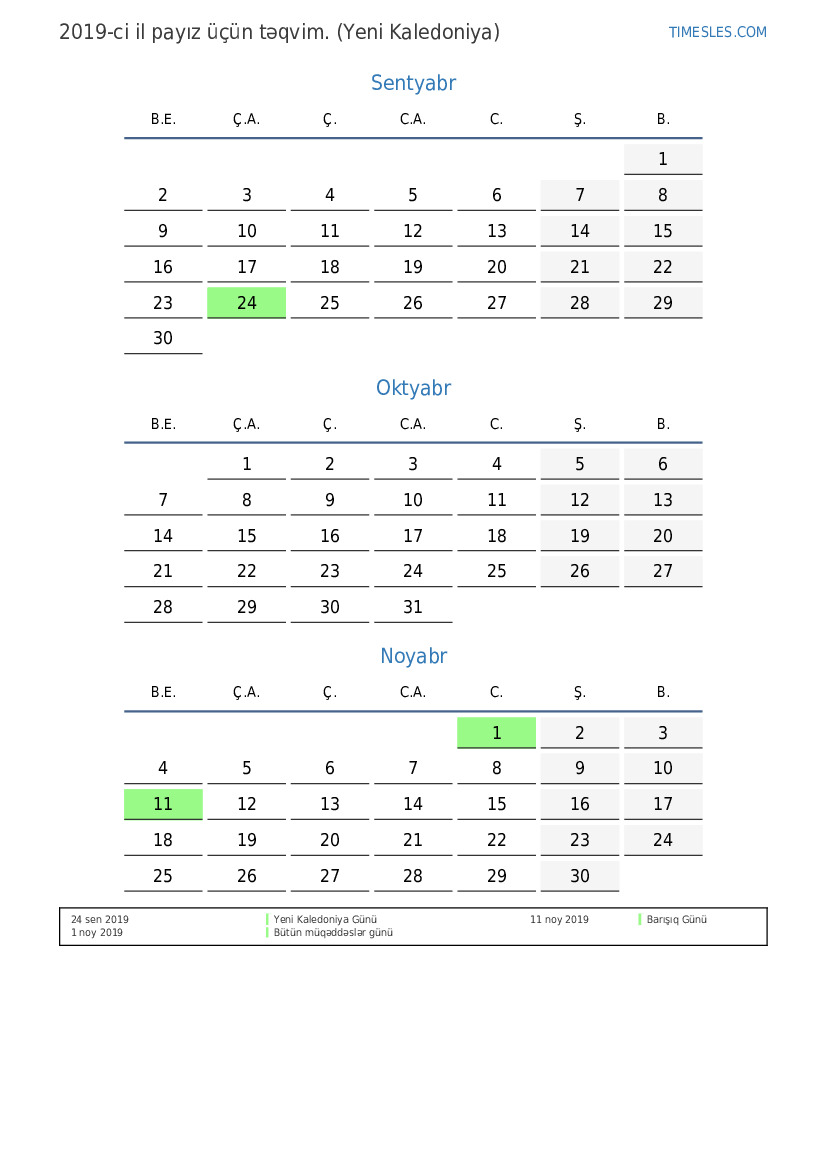 Yeni Kaledoniya üçün 2019-ci il payız üçün təqvim