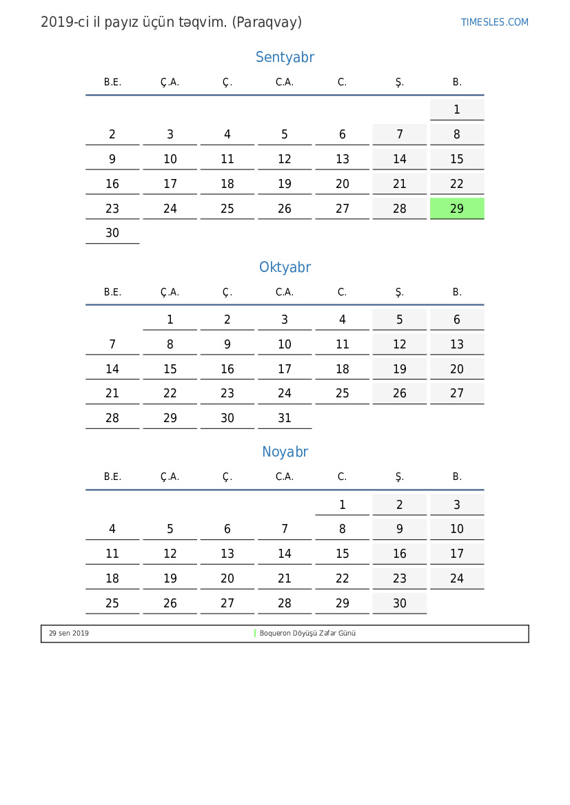 Paraqvay üçün 2019-ci ilin payız üçün tətil və həftə sonları ilə PDF təqvimini yükləyin və çap edin
