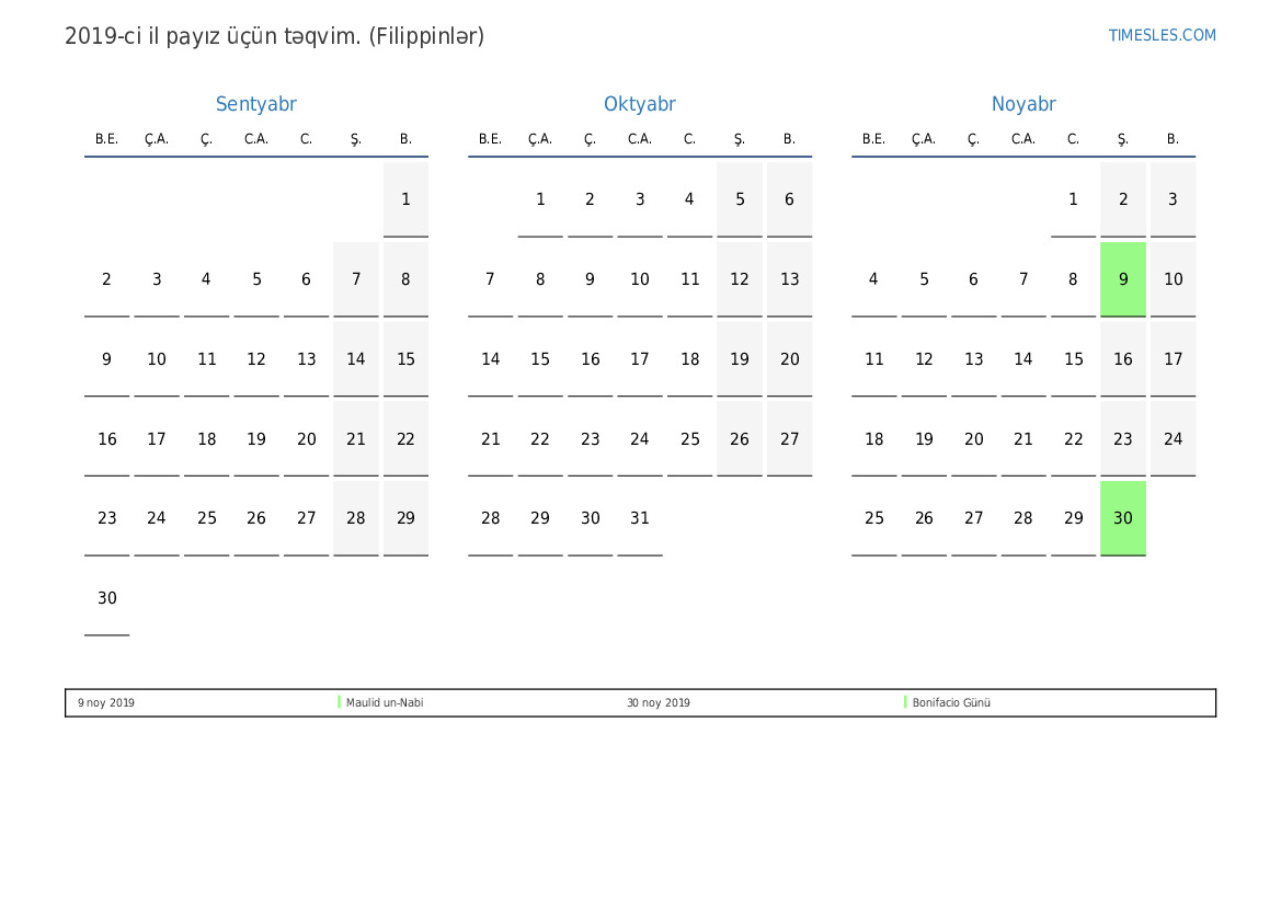 Filippinlər üçün 2019-ci ilin payız üçün tətil və həftə sonları ilə PDF təqvimini yükləyin və çap edin