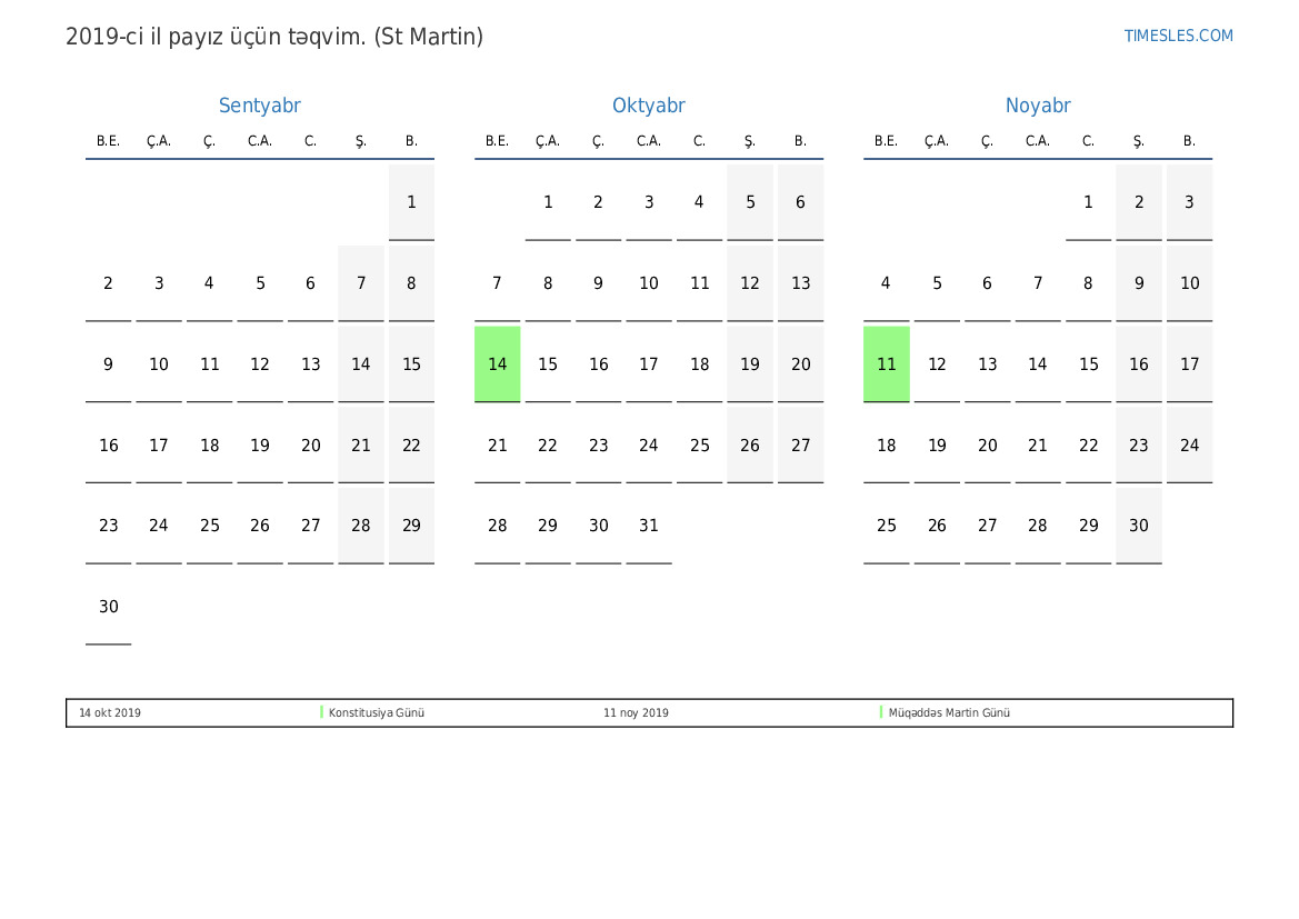 Sint Maarten üçün 2019-ci ilin payız üçün tətil və həftə sonları təqvimi