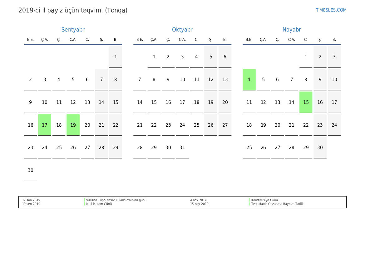 Tonqa üçün 2019-ci ilin payız üçün tətil və həftə sonları təqvimi