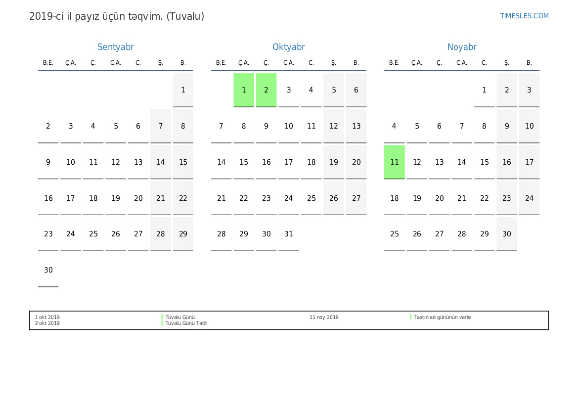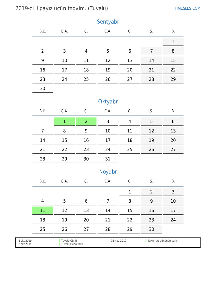 Tuvalu üçün 2019-ci il payız üçün təqvim