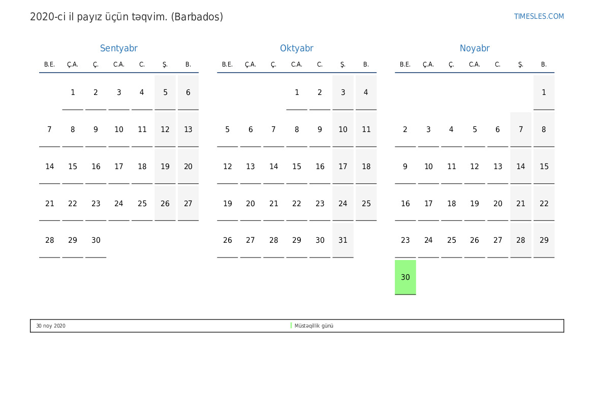 Barbados üçün 2020-ci ilin payız üçün tətil və həftə sonları ilə PDF təqvimini yükləyin və çap edin