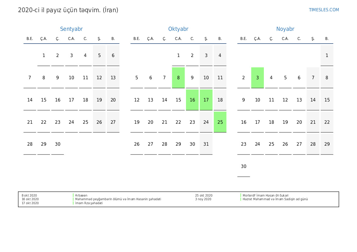 İran üçün 2020-ci ilin payız üçün tətil və həftə sonları təqvimi