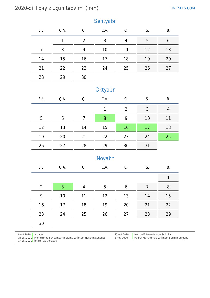 İran üçün 2020-ci ilin payız üçün tətil və həftə sonları ilə PDF təqvimini yükləyin və çap edin