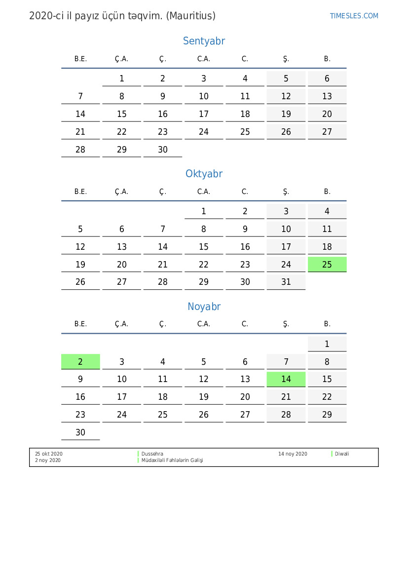 Mauritius üçün 2020-ci il payız üçün təqvim
