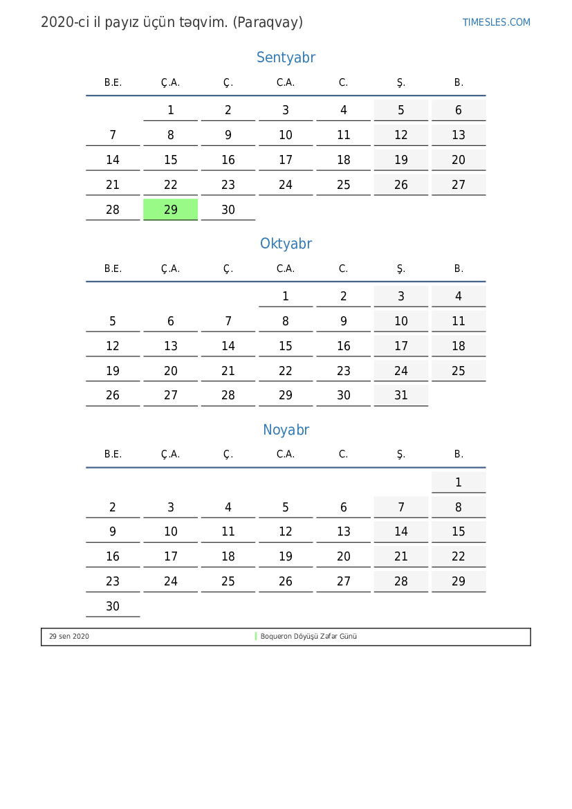 Paraqvay üçün 2020-ci ilin payız üçün tətil və həftə sonları ilə PDF təqvimini yükləyin və çap edin