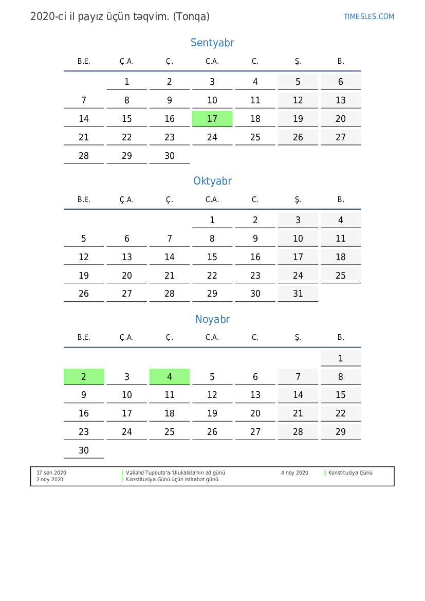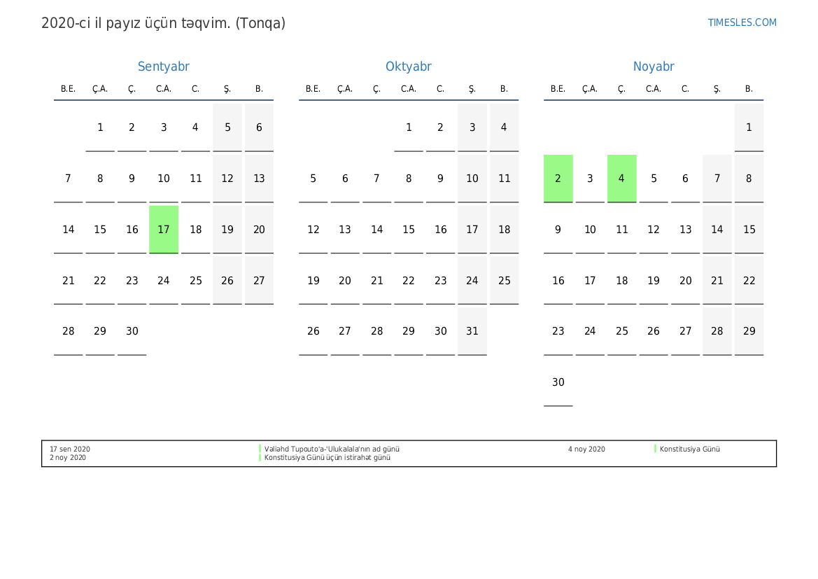 Tonqa üçün 2020-ci ilin payız üçün tətil və həftə sonları təqvimi