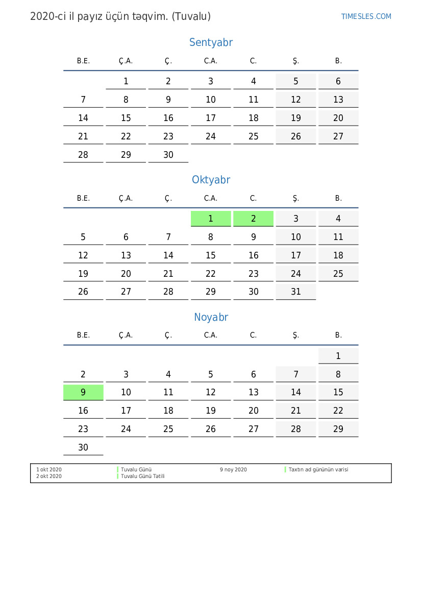 Tuvalu üçün 2020-ci il payız üçün təqvim