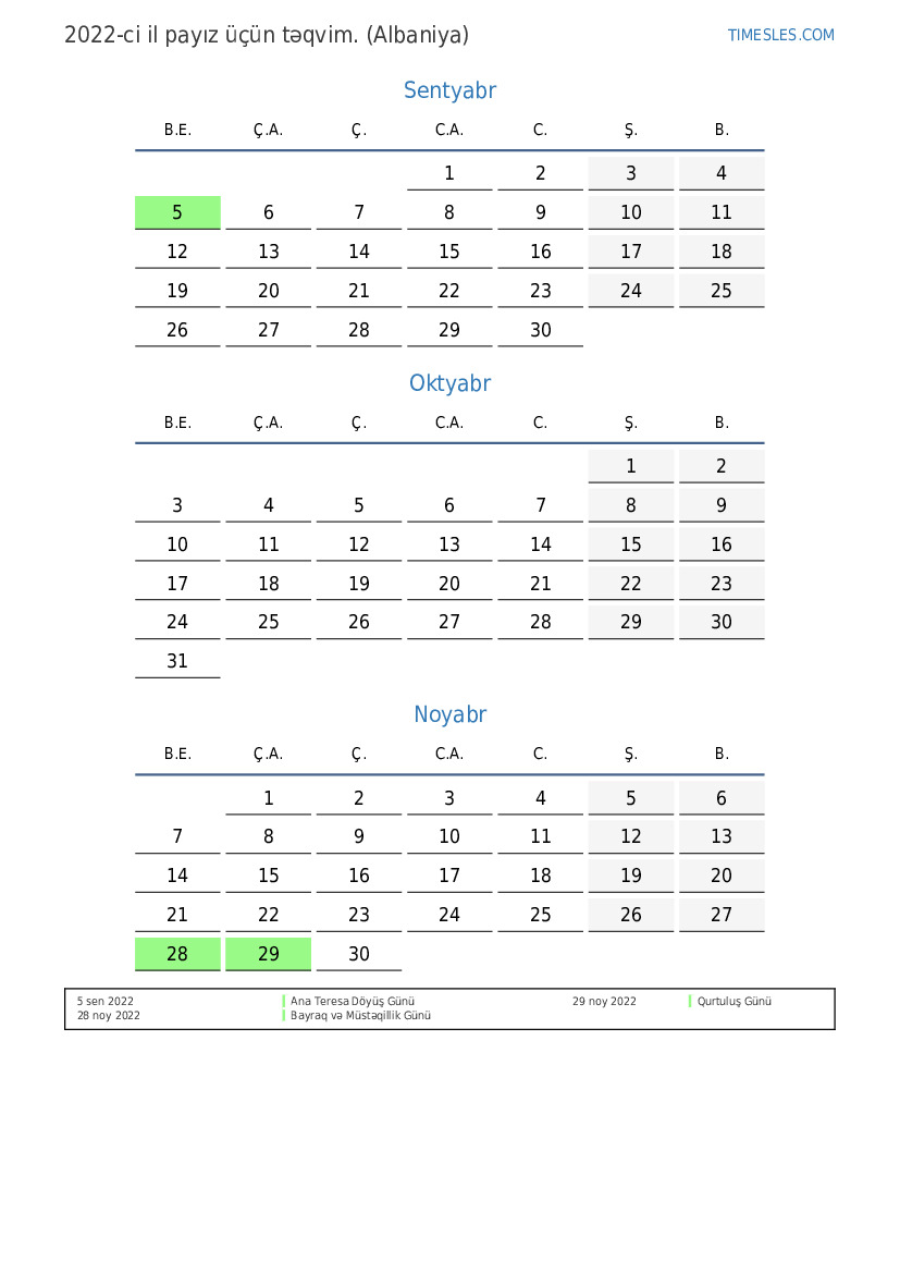 Albaniya üçün 2022-ci ilin payız üçün tətil və həftə sonları təqvimi