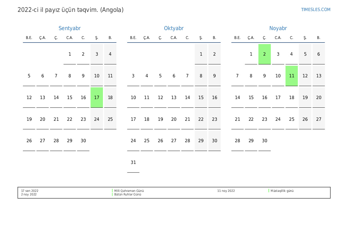 Angola üçün 2022-ci ilin payız üçün tətil və həftə sonları ilə PDF təqvimini yükləyin və çap edin