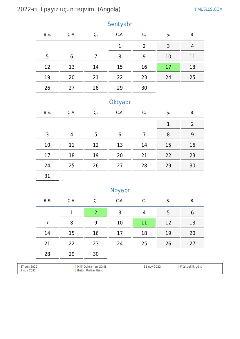 Angola üçün 2022-ci ilin payız üçün tətil və həftə sonları təqvimi