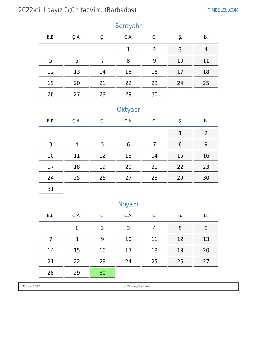 Barbados üçün 2022-ci il payız üçün təqvim