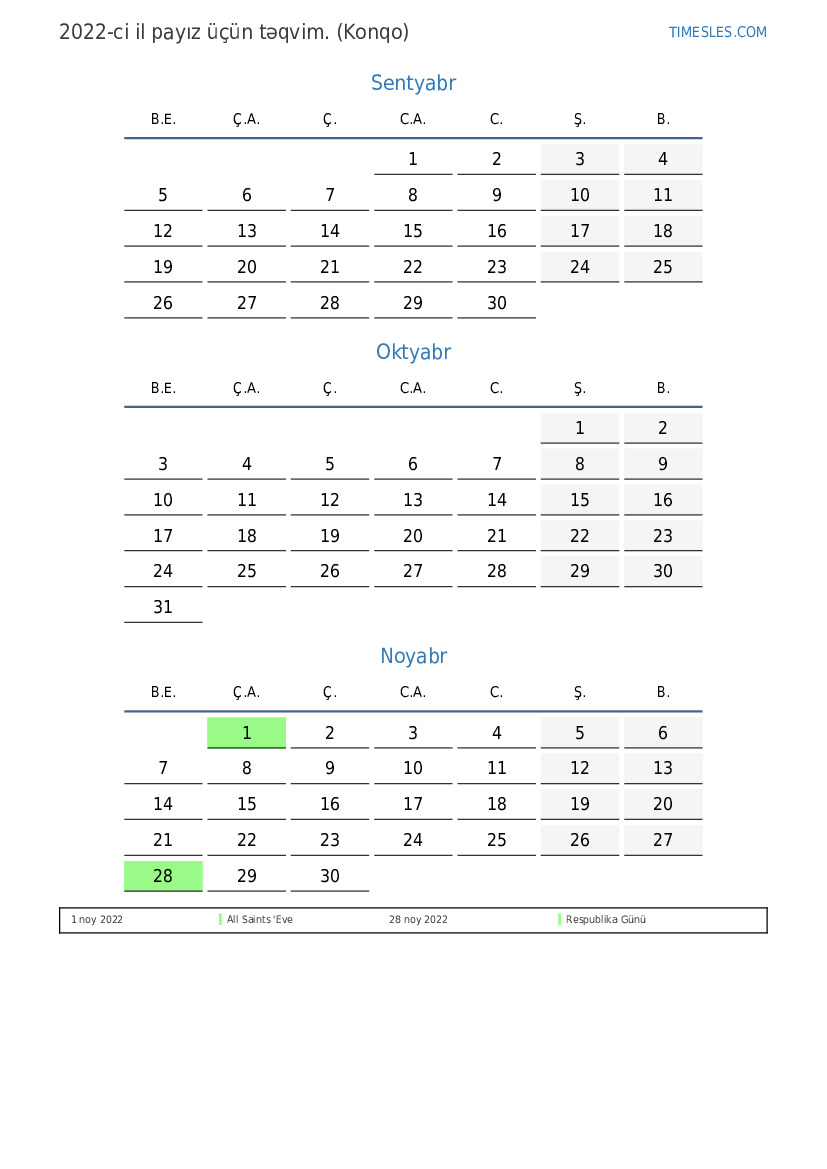Konqo üçün 2022-ci ilin payız üçün tətil və həftə sonları təqvimi