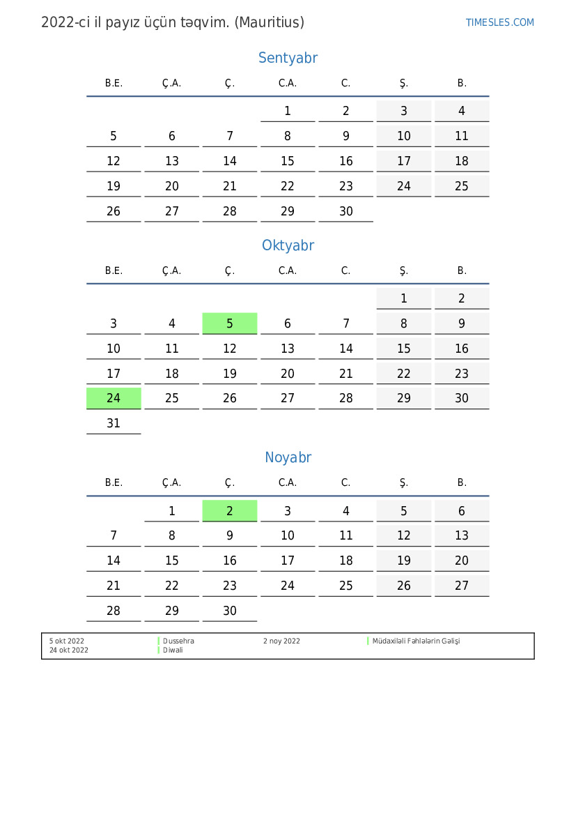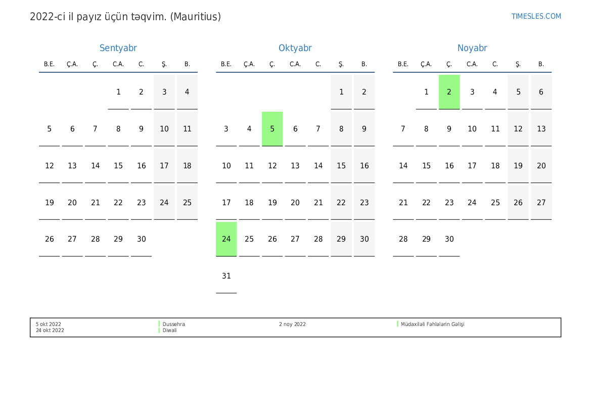 Mauritius üçün 2022-ci il payız üçün təqvim