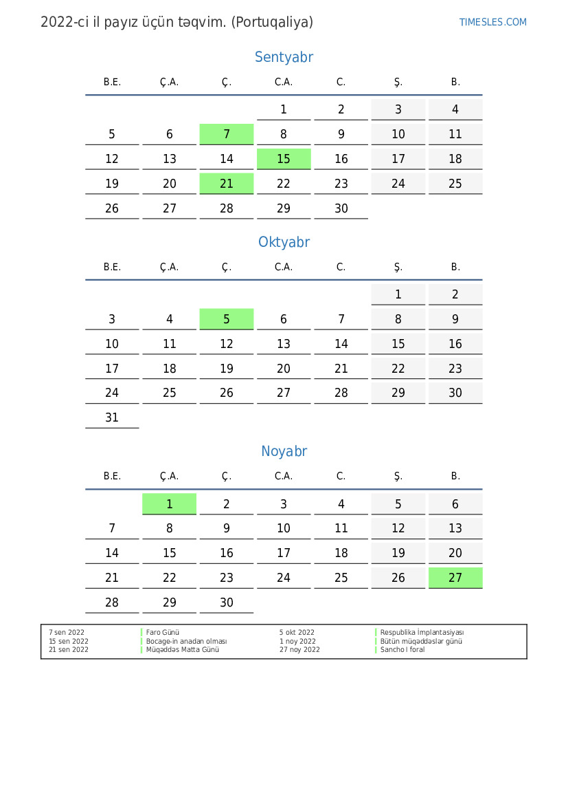 Portuqaliya üçün 2022-ci il payız üçün təqvim