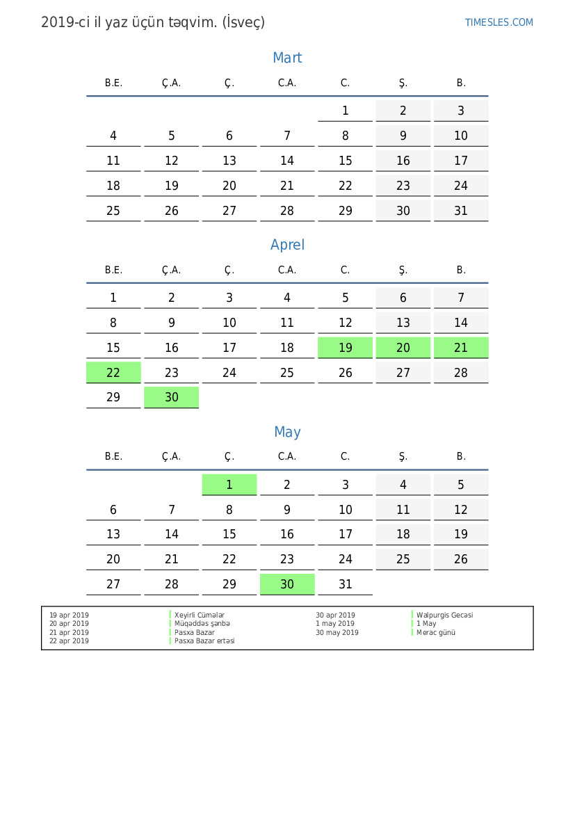 İsveç üçün 2019-ci il yaz üçün təqvim