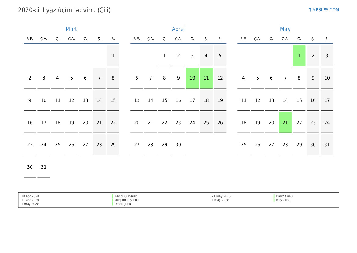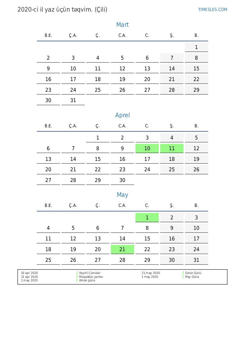 2020-ci ilin Yazda Çilidə 8 tətil və istirahət günləri var. Bahar 2020 bazar günü başlayır və bazar günü günü bitir.
