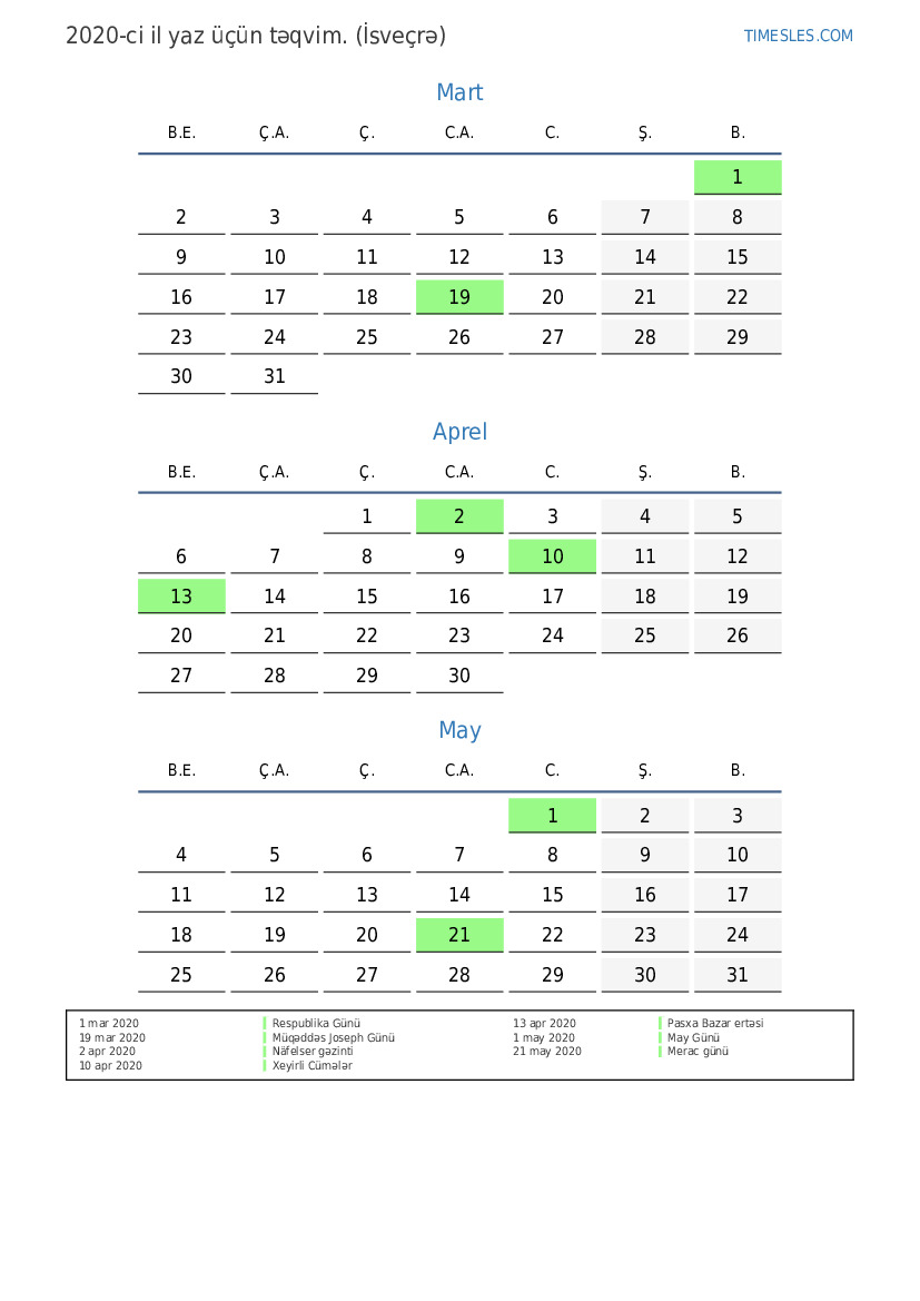 İsveçrə üçün 2020-ci ilin yaz üçün tətil və həftə sonları təqvimi