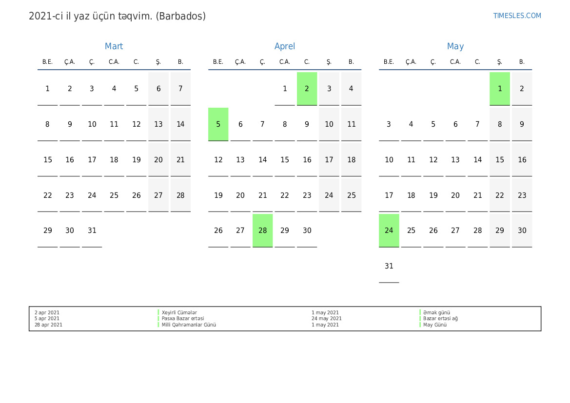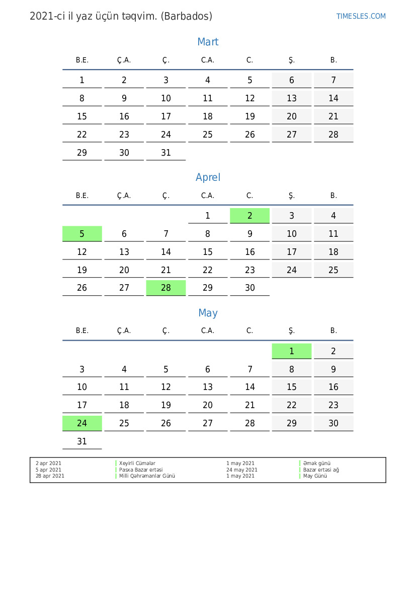 2021-ci ilin Yazda Barbadosda 10 tətil və istirahət günləri var. Bahar 2021 bazar ertəsi başlayır və bazar ertəsi günü bitir.