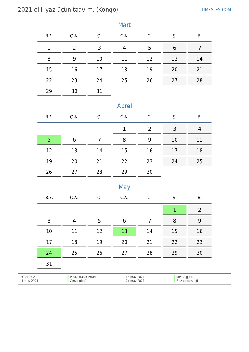 Konqo üçün 2021-ci ilin yaz üçün tətil və həftə sonları təqvimi