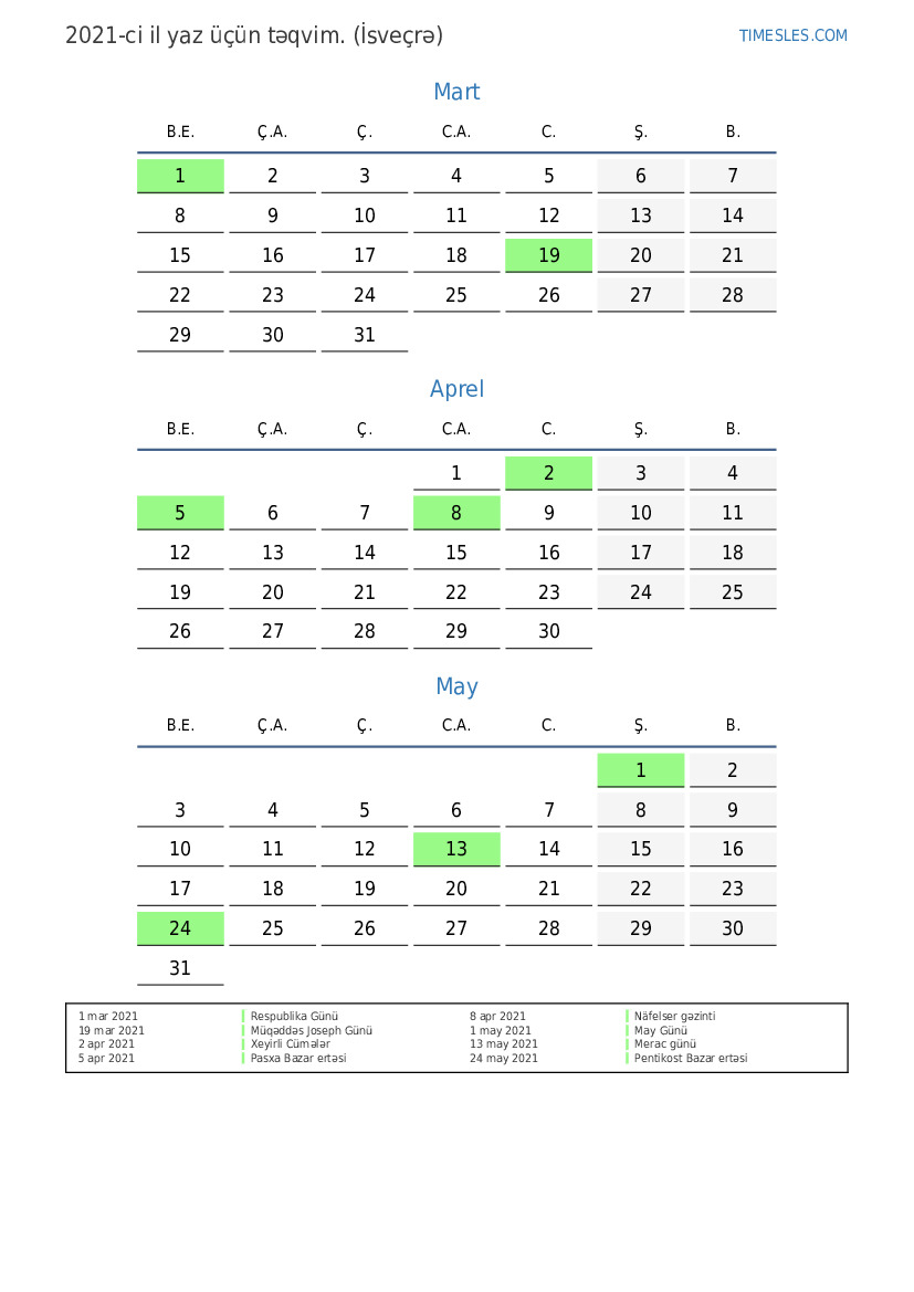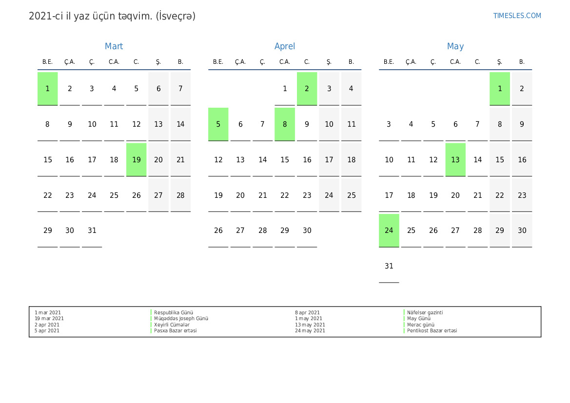 İsveçrə üçün 2021-ci il yaz üçün təqvim